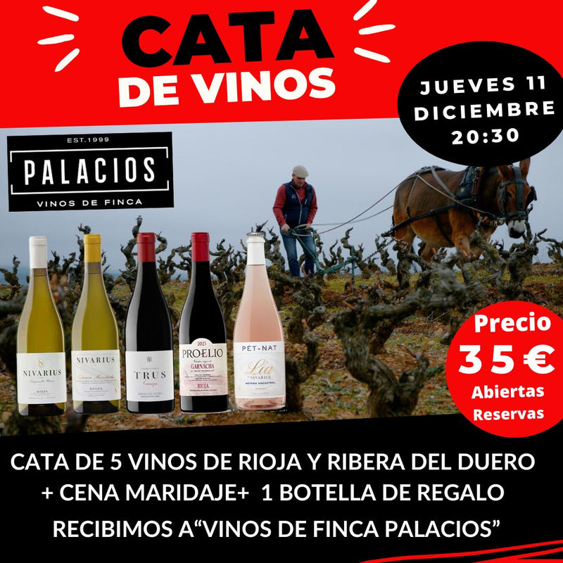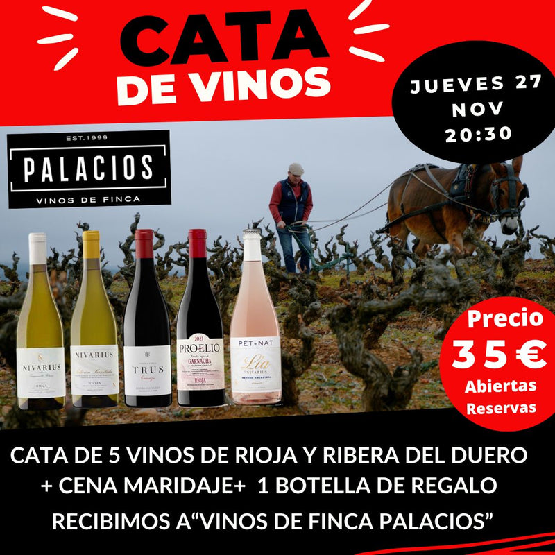 Cata guiada de 5 vinos de Bodegas Palacios + Cena Maridaje + 1 botella de vino de regalo.
