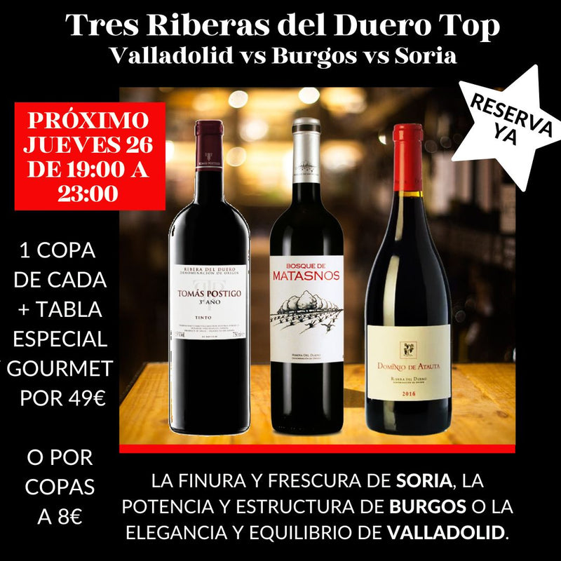 Este Jueves 26 de 19:00 a 23:00 vente a probar 3 grandes vinos de la D.O. Ribera del Duero, cada uno representando a las 3 principales provincias que componen la Denominación y elige tu favorito.