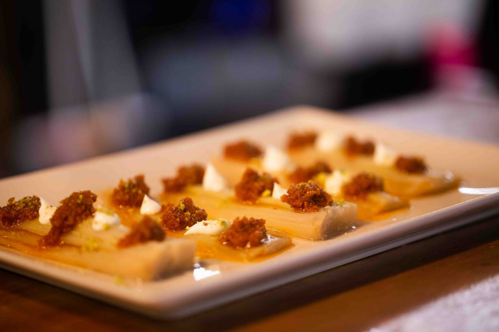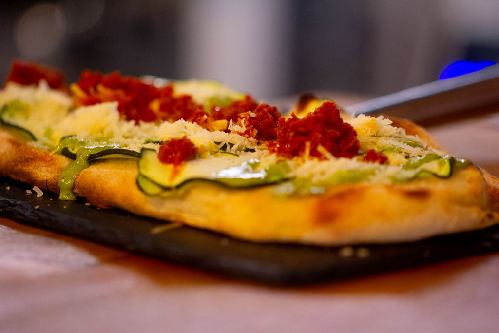 Pinsas de Burrata y Mortadela de Bolonia. Calabacín y pesto de pistacho. Quesos y Pera conferencia. Guacamole y Ventresca.